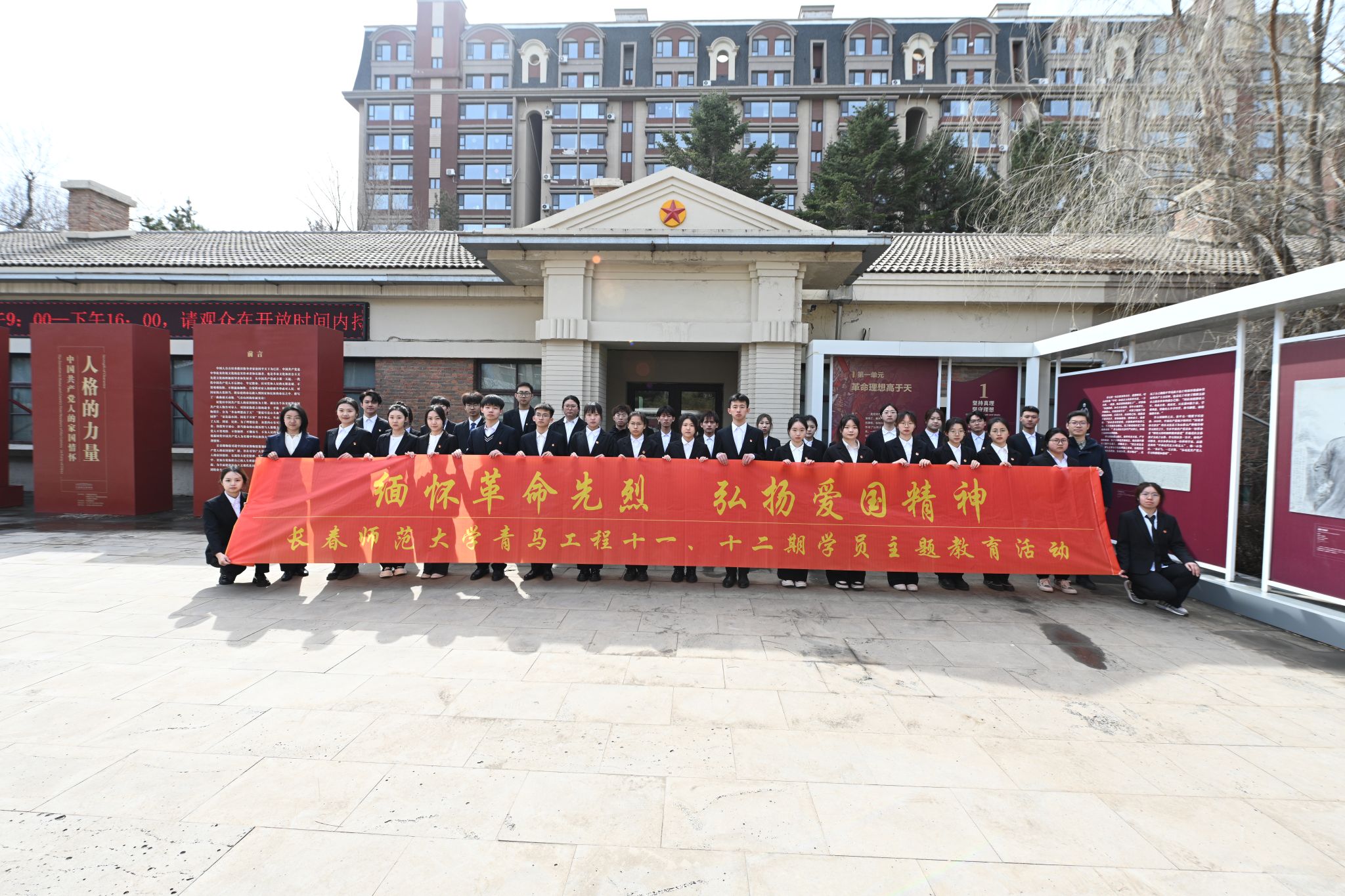 青马学员代表、学生骨干徐浩然现场讲述微团课,带领同学们共同回眸历史,深切感怀和传承英烈精神。在这座曾经与长春共存亡的“南大营”,同学们面向团旗,举起右拳,庄严宣誓,重温入团誓言。声声誓言掷地有声,不仅是追寻先烈足迹,更是牢记先辈嘱托、传承红色血脉,长师青年正以实际行动践行青春担当。