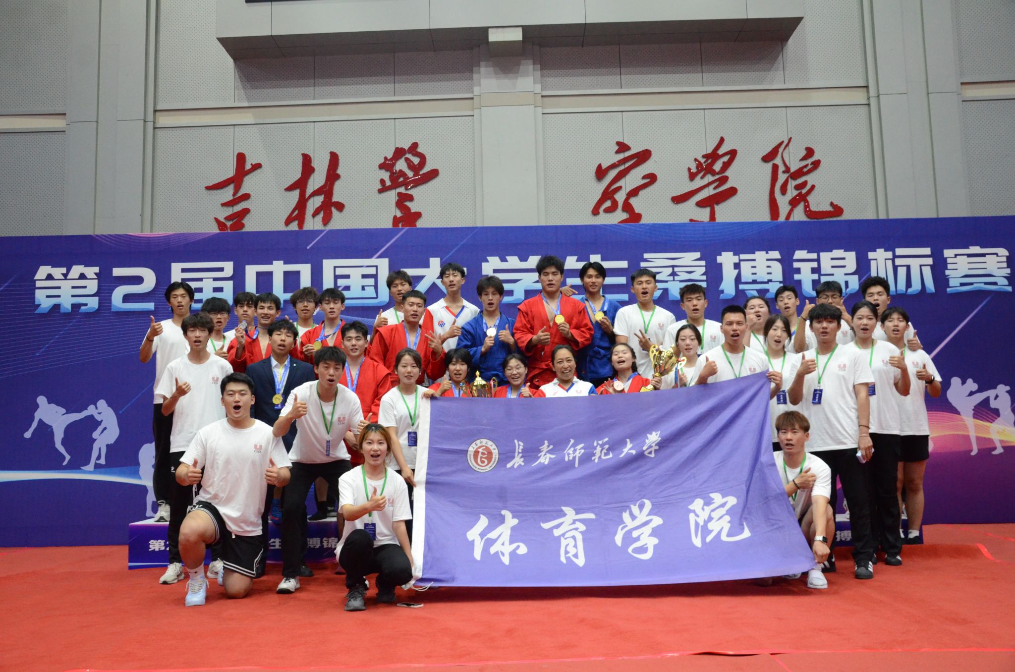 7月10日至15日,在由中国学生体育联合会主办,长春市体育局、长春市柔道协会承办的第二届中国大学生桑搏锦标赛中,我校桑搏代表队在体育学院院长张镜宇和教练员段东平、刘野带领下,曾渊淏、吉洺石、马占海、闫思淇等13名同学斩获4枚金牌、3枚银牌、6枚铜牌,同时获得运动式甲B男子、女子团体总分第一名,格斗式桑搏甲B男子团体总分第二名,段东平、刘野荣获优秀教练员称号。
